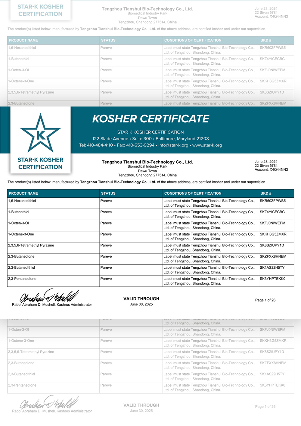 滕州市天水生物科技有限公司成立于2011年9月,是目前國內(nèi)雜環(huán)類合成食品香料、日化香料和醫(yī)藥中間體生產(chǎn)經(jīng)營的綜合性企業(yè)。坐落于山東省滕州市生物醫(yī)藥產(chǎn)業(yè)基地,總投資5000余萬元,占地面積約30000平方米,員工百余人。公司先后被評為高新技術企業(yè)、專精特新中小企業(yè)、科技型中小企業(yè),建有市級重點實驗室1處,并先后獲得ISO9001質(zhì)量體系認證、ISO22000食品安全體系認證、kosher認證和Halal認證。是香精香料及食品配料協(xié)會會員單位及滕州市中小企業(yè)協(xié)會理事單位。